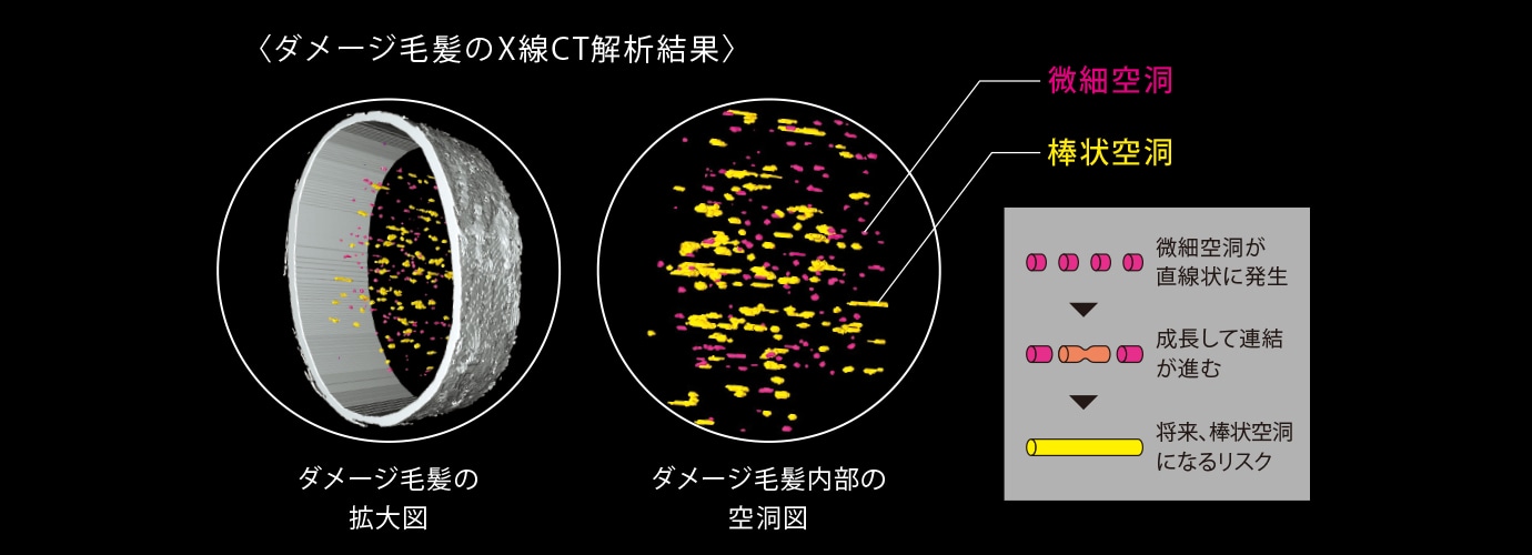 世界20カ国を越える女性の毛髪ダメージの核心に迫り、枝毛や切れ毛の要因ひとつとしてたどり着いた毛髪内部の棒状空洞。世界最高性能の放射光施設SPring-8を駆使して、さらにナノレベルの精度で観察を続け、棒状空洞よりさらに小さな微細空洞を発見しました。微細空洞が成長し、やがて棒状空洞になるリスクがあることもわかりました。