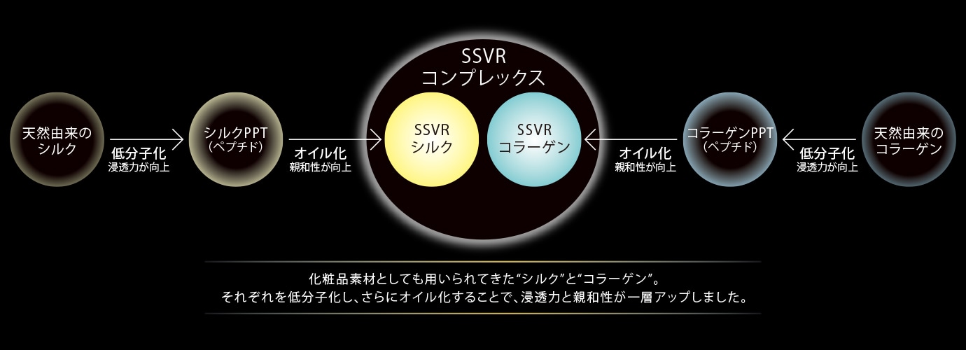 SSVRコンプレックスとは、天然由来'シルク'と'コラーゲン'を素材として、浸透力と親和性を高めたSSVRシルク※1とSSVRコラーゲン※2です。髪なじみがよく、微細空洞まで働きかけて毛髪内密度を高め、補修します。
