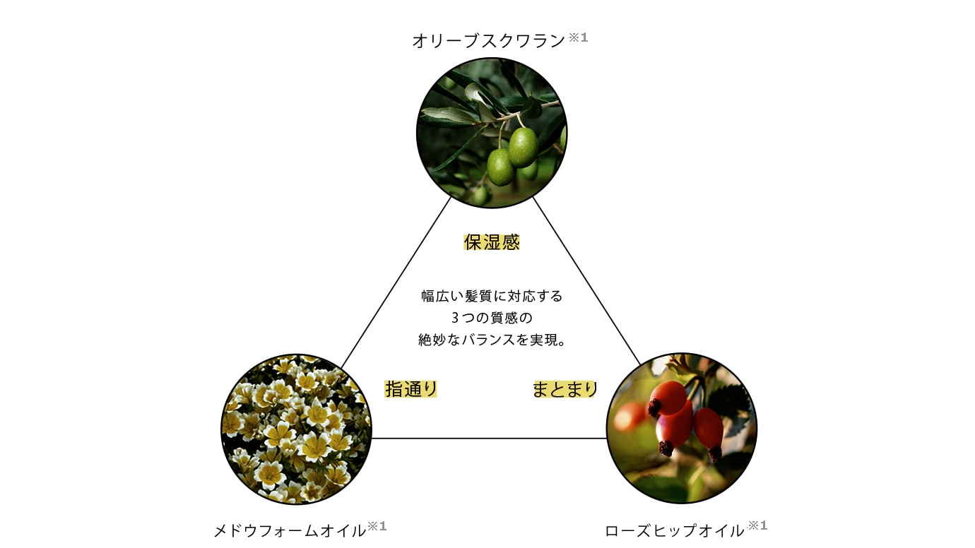 保湿感を付与するオリーブスクワランと「指通り」を付与するメドウフォームオイル、「まとまり」を付与するローズヒップオイルで幅広い髪質で実感しやすく、3つの質感を高めます。