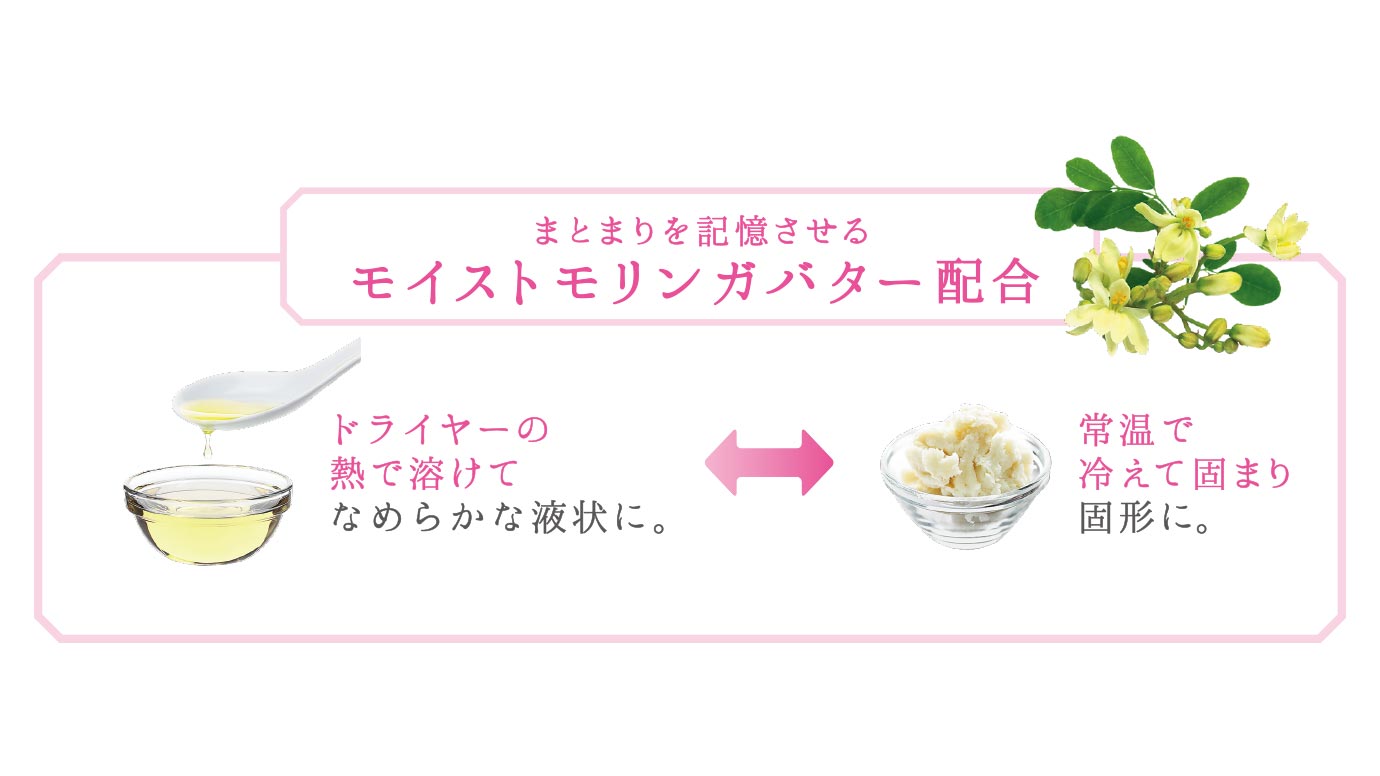 まとまり保持成分のモイストモリンガバター※はドライヤーを当てると、熱によって溶けなめらかな状態になります。ドライ後、常温になると冷えて固まるため、朝まで髪のまとまりを記憶させます。