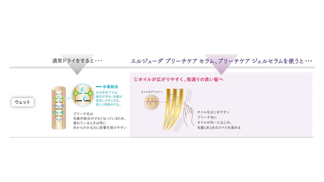 ウェット時、オイルをはじきやすいブリーチ毛にオイルが均一になじみ、毛髪1本1本のスベリを高めます。
