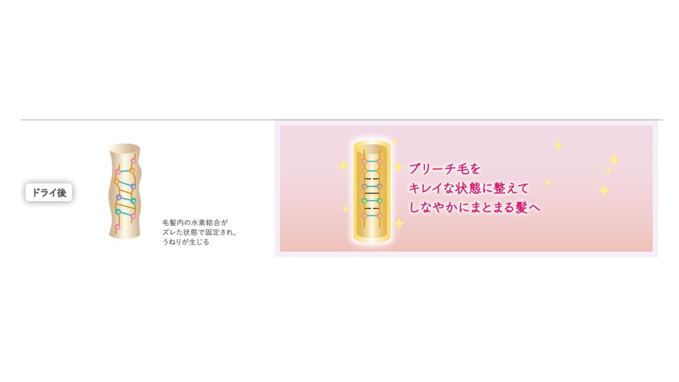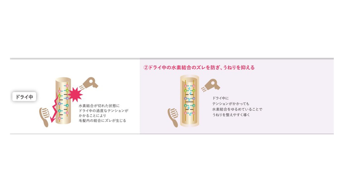 ドライ中にテンションがかかっても水素結合をゆるめていることでうねりを整えやすく導きます。