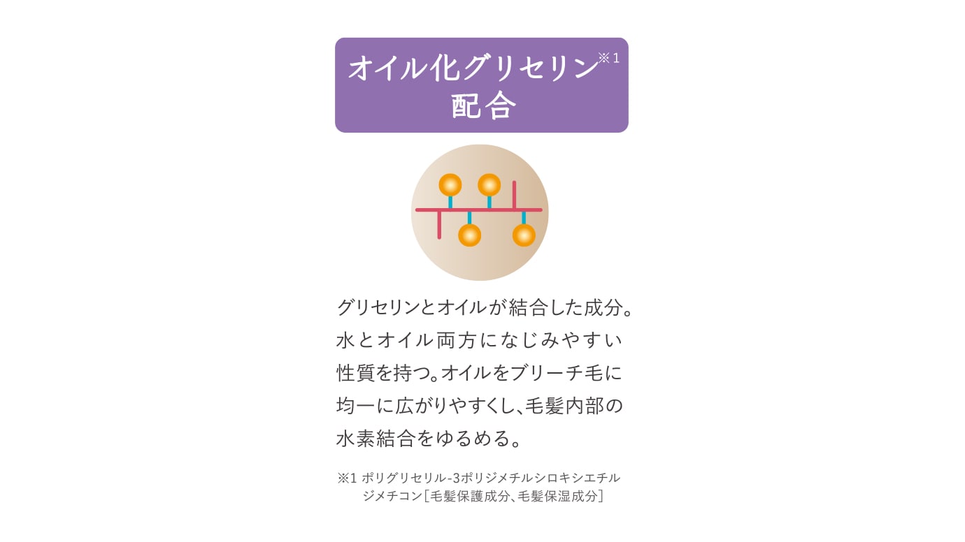 オイルをブリーチ毛に均一広がりやすくするオイル化グリセリン※1配合