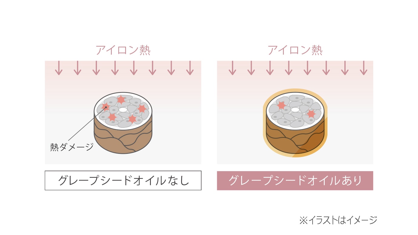 熱ダメージを抑制し、毛髪を保護するグレープシードオイル※4配合。気になる髪への負担を軽減し、アイロンスタイリングが楽しめます。