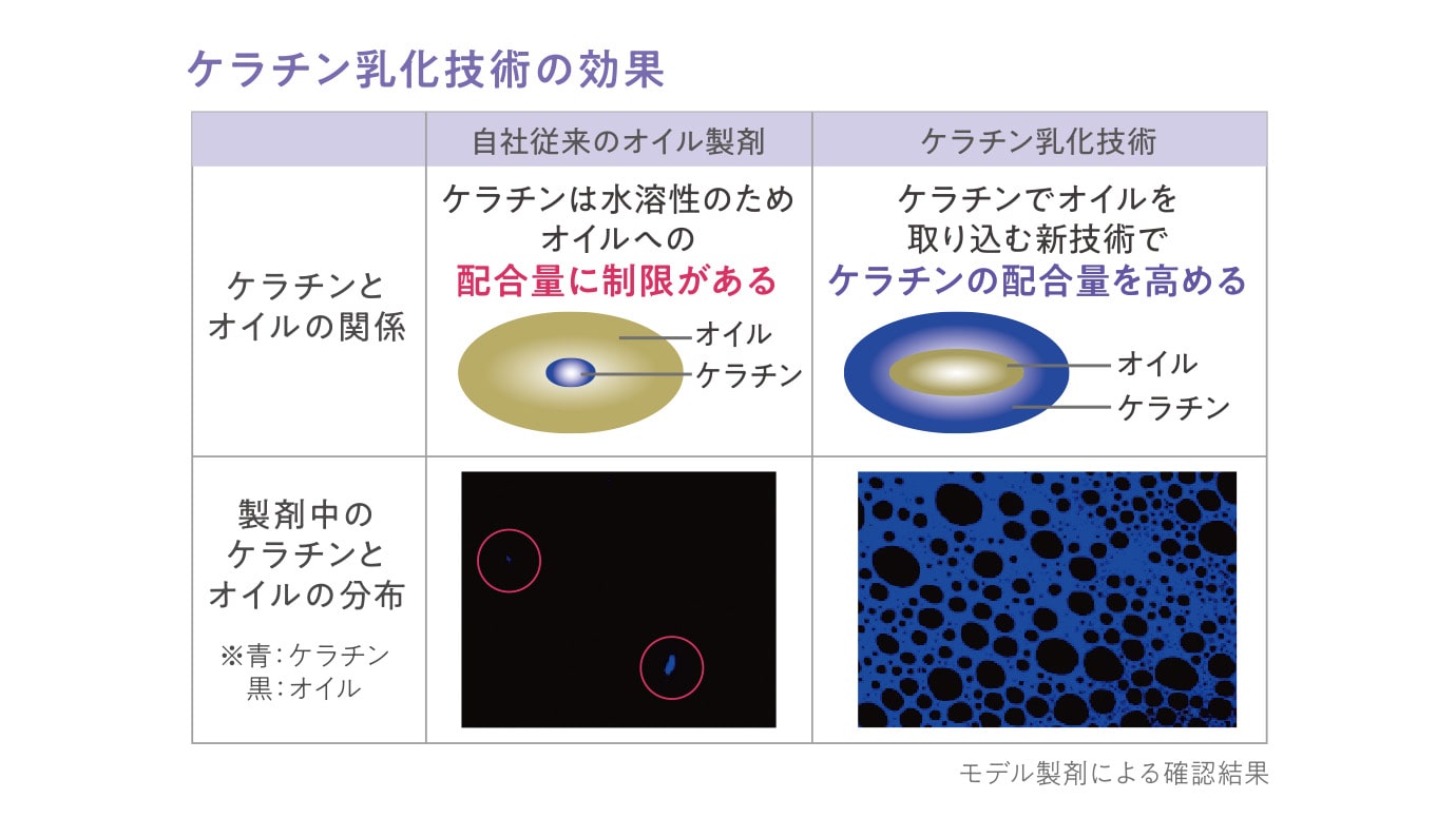 ケラチン乳化技術によりオイルへの『Wリペアケラチン※1』高配合※2を達成。不均一なハイダメージを内部から補修し、均一に整える。