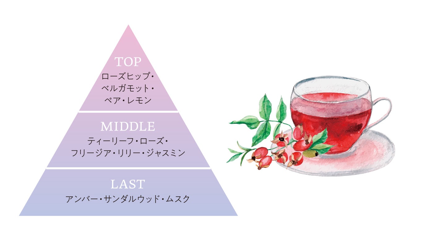 ローズヒップティーを基調とした高級感があり、心安らぐひとときにぴったりの香り