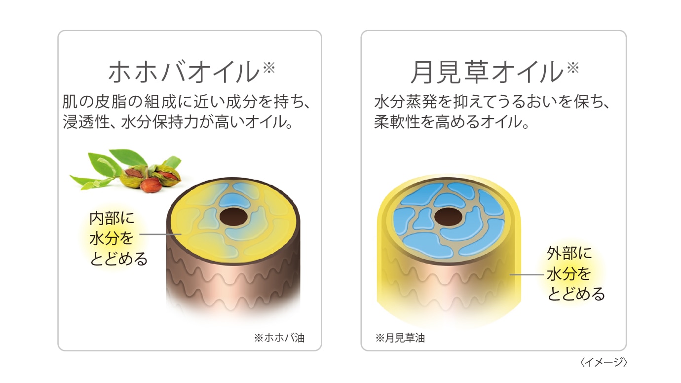 毛髪内の水分をしっかりと閉じ込める植物由来のエモリエントオイルを配合。Fには浸透性・水分保持力が高いホホバオイル※1を、Mには水分蒸発をおさえてうるおいを保つ月見草オイル※2が配合されています。