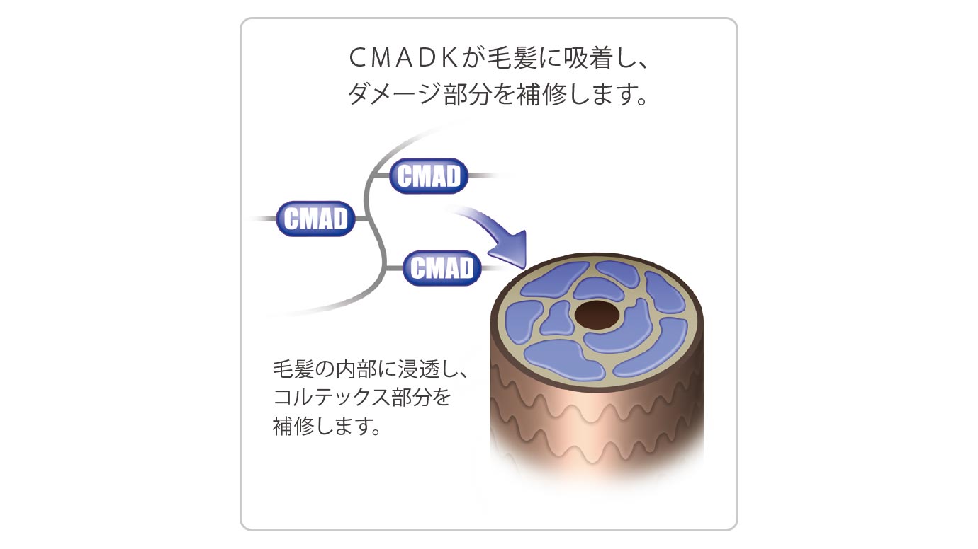 ケラチン由来のタンパク質・CMADK※が毛髪内部に浸透して吸着。毛先まで均一にダメージを補修し、髪が水分を蓄えられる状態に整えます。