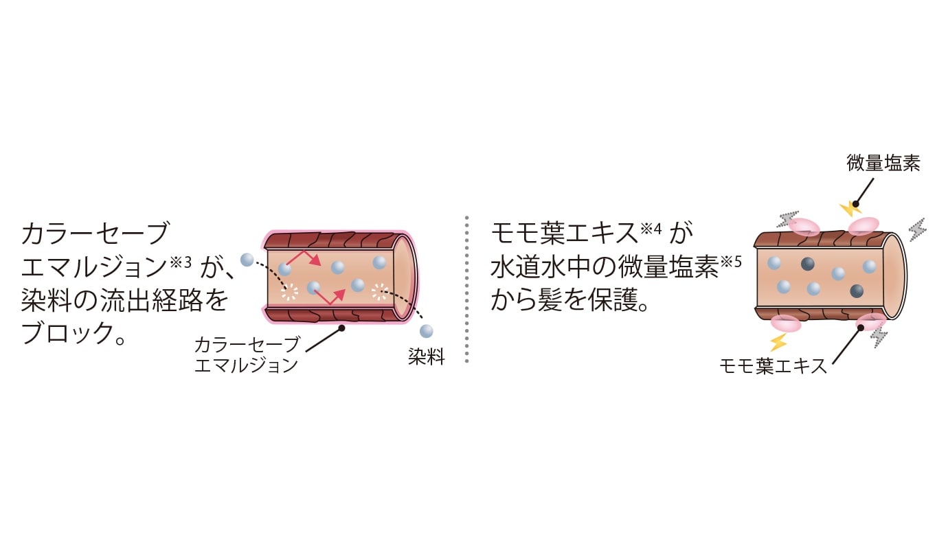 ※4 モモ葉エキス[毛髪保護成分]、※5 水道水に殺菌目的で含まれる次亜塩素酸Naなどのこと