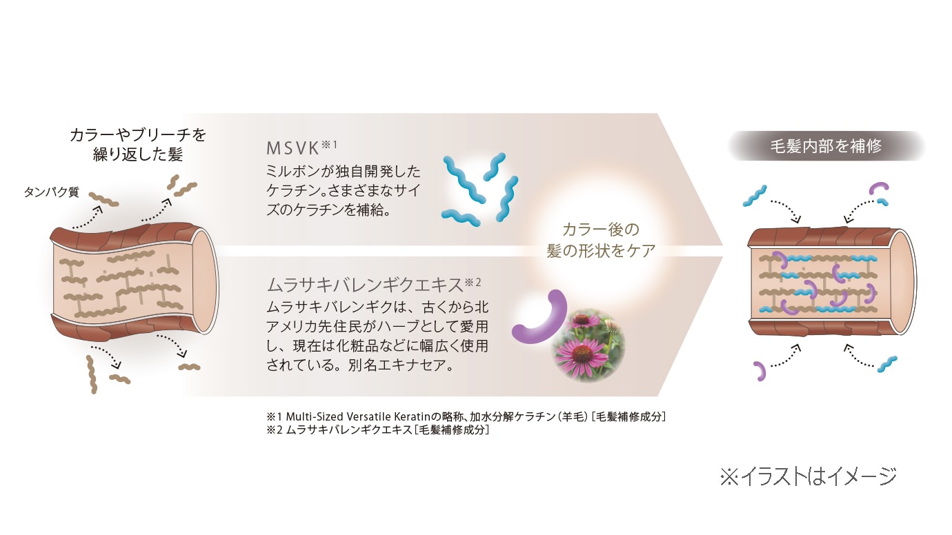 MSVK※1とムラサキバレンギクエキス※2で毛髪内部を補修し、形状をケアしてうねりにくい髪に導きます。