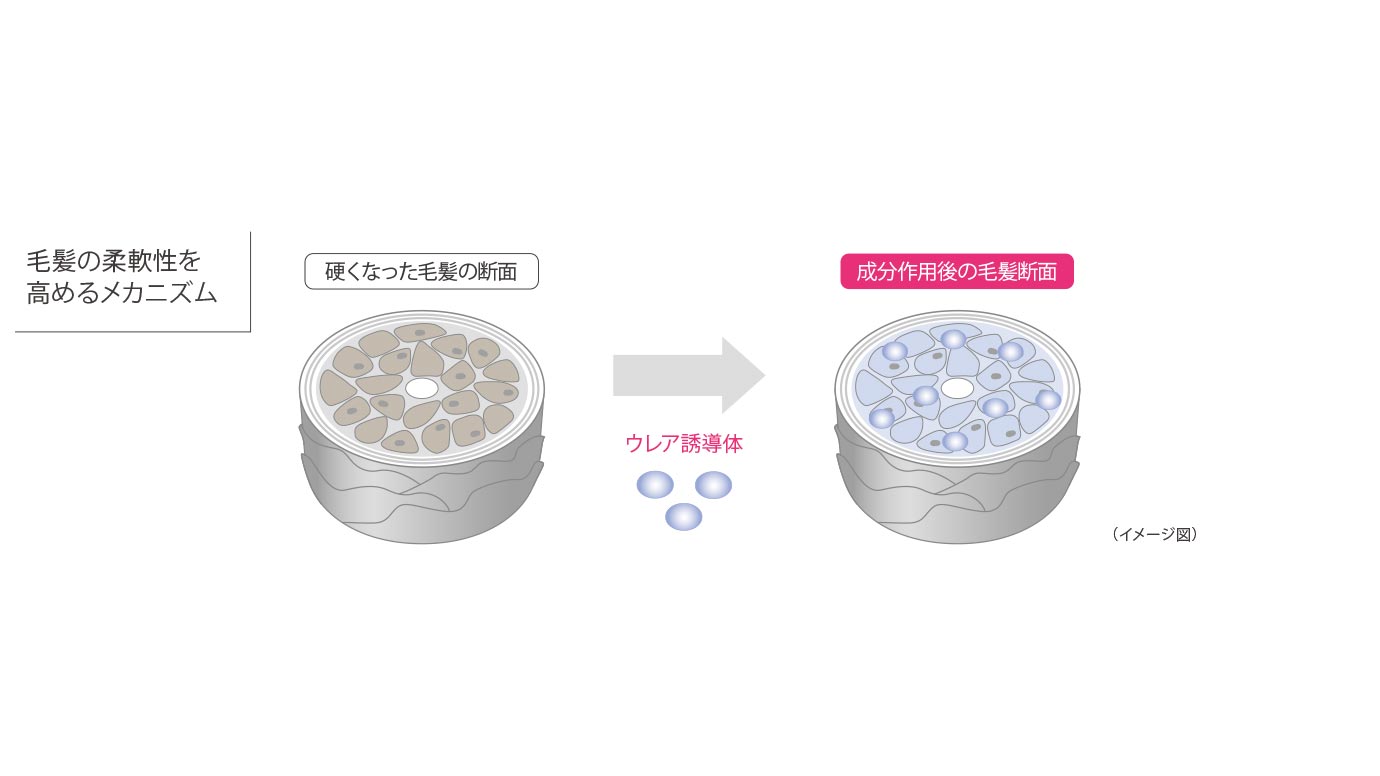 オージュア フィルメロウに配合されている「ウレア誘導体」※は硬くなった髪をやわらかな髪へ導く柔軟成分。熱で硬くなった髪のタンパク質に働きかけ、柔軟性を高めます。
