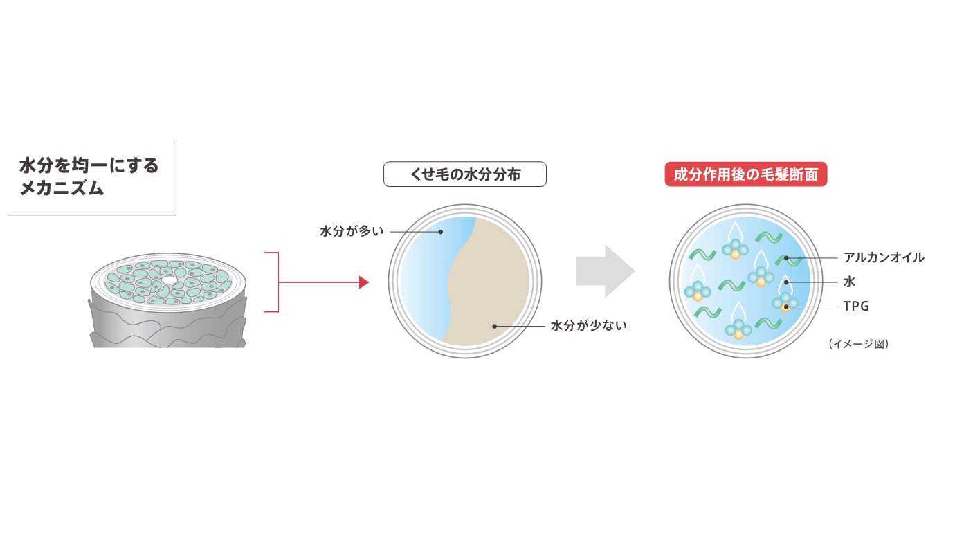 保湿成分のTPG※1が水分量の分布を均一にし、水分量が偏った髪へまとまりをもたらします。毛髪内部まで浸透する油性成分アルカンオイル※2が潤滑成分となり、髪の柔軟性を高めます。