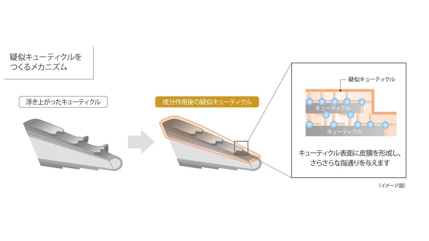化学的、物理的ダメージで浮き上がったキューティクル表面にすべりの良い皮膜をつくり、さらさらな髪に導きます。