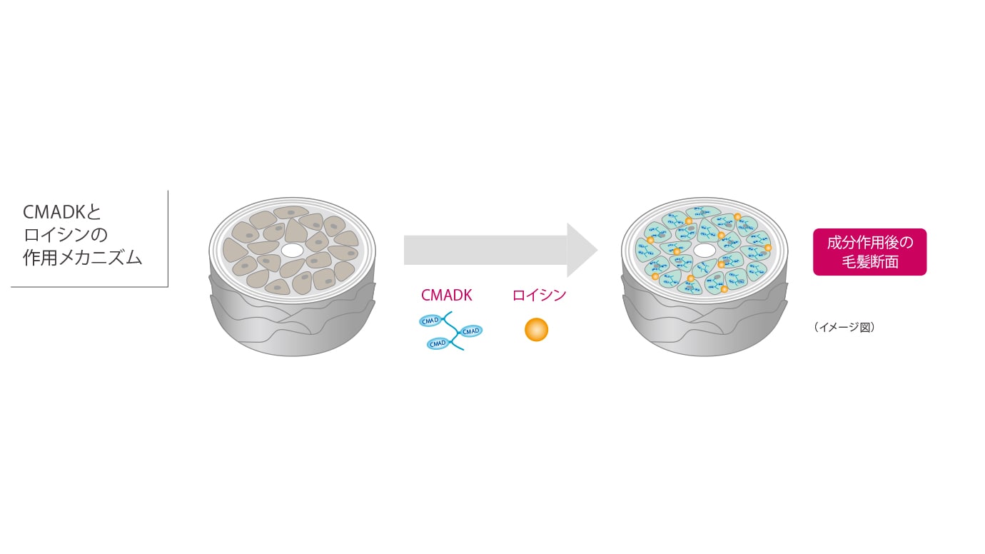 オージュア イミュライズに配合されている毛髪補修成分のCMADK※が髪の内部まで浸透。さらに浸透補助成分のロイシンがCMADKの浸透を助け、ダメージに負けない健やかな髪へ導きます。