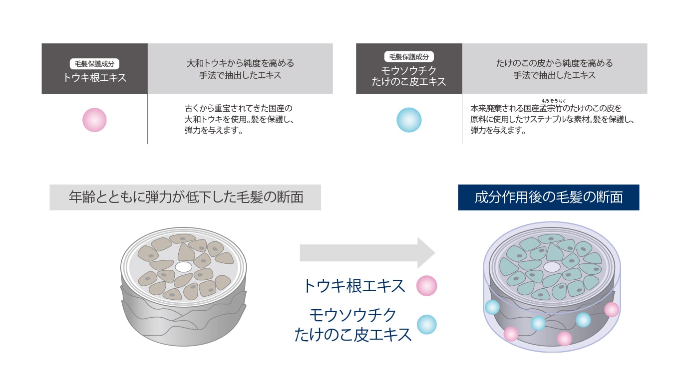 「年齢とともに弾力が低下した髪」にアプローチし、髪に弾力を与えます。