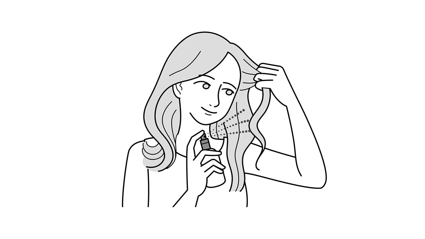 毛先にスプレーし、指で毛束をつまんでやわらかく整えます。