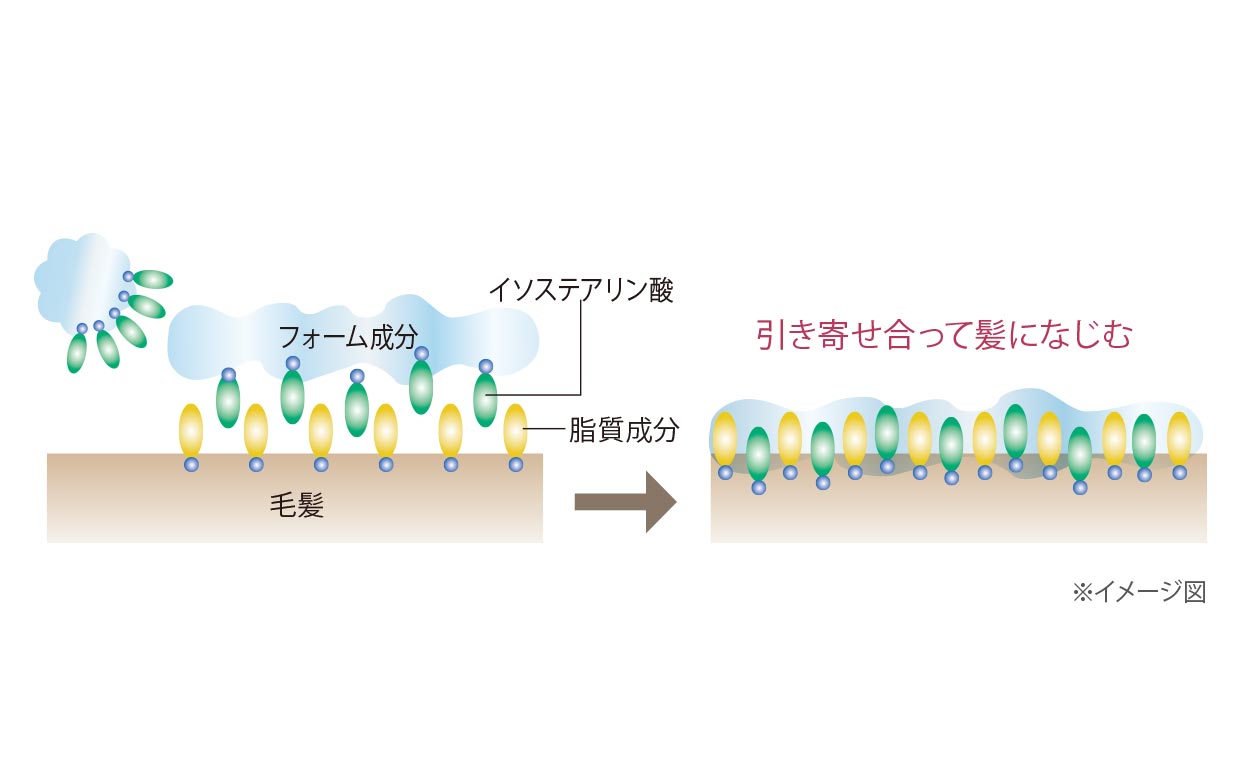 毛髪表面の脂質に似た構造を持つ、毛髪保護成分イソステアリンを配合。フォームの泡と脂質が互いに引き寄せあい、乾いた髪にも泡を均一につけることができます。