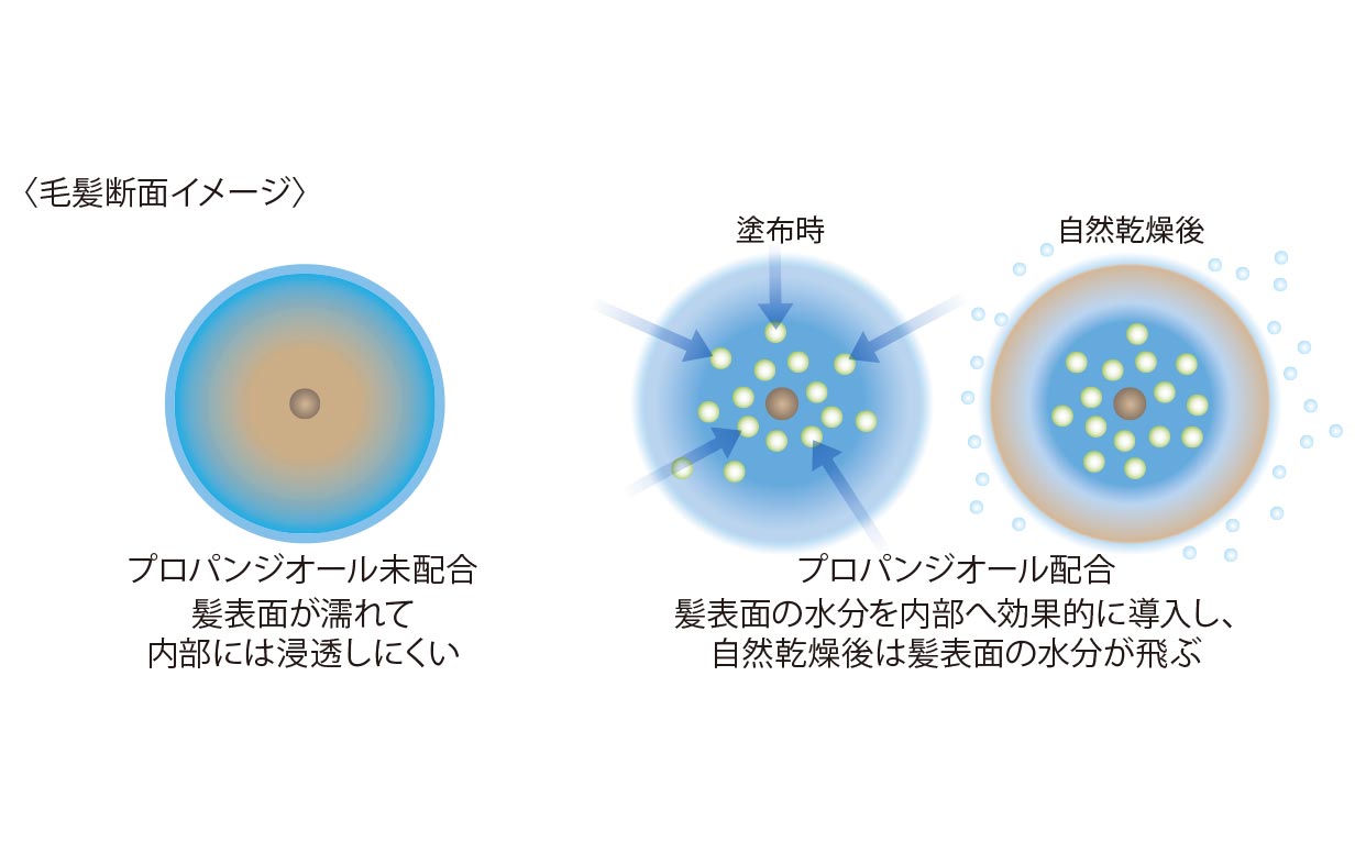 水分保持力の強いプロバンジオール(浸透促進成分)が毛髪内部まで水分を補給。自然乾燥後には表面の水分が飛ぶため、濡れ感を感じないウェーブが表現できます。