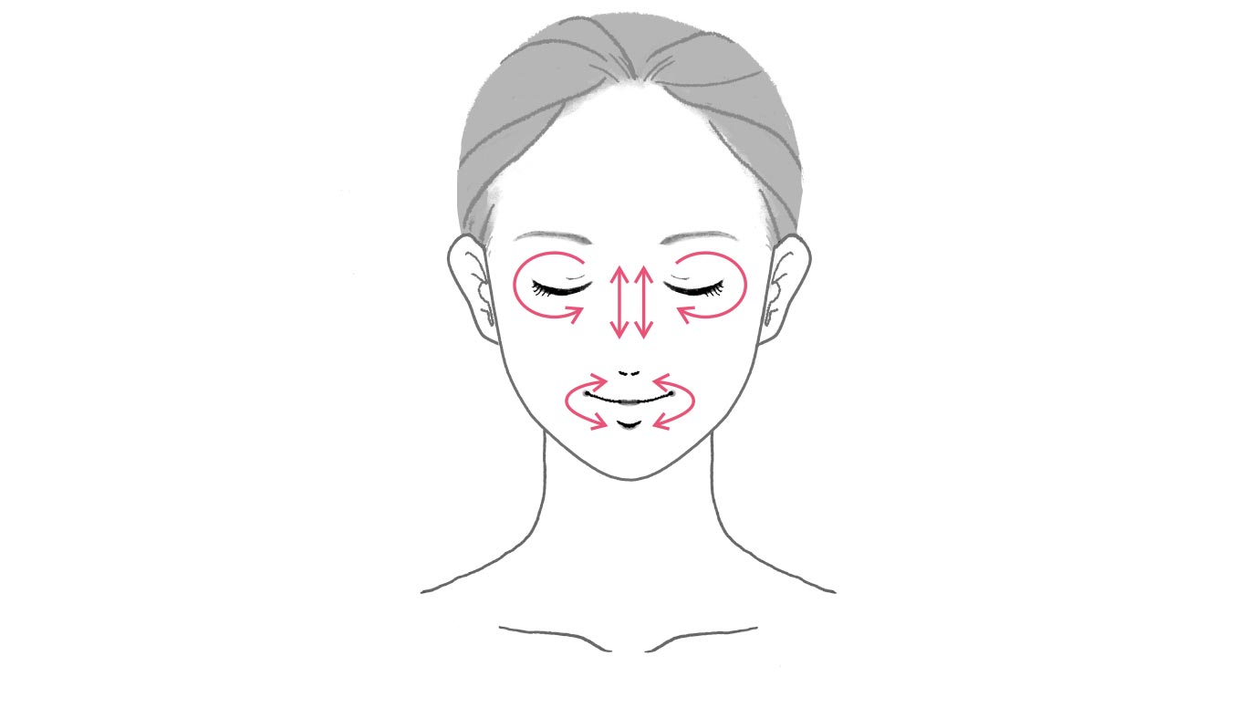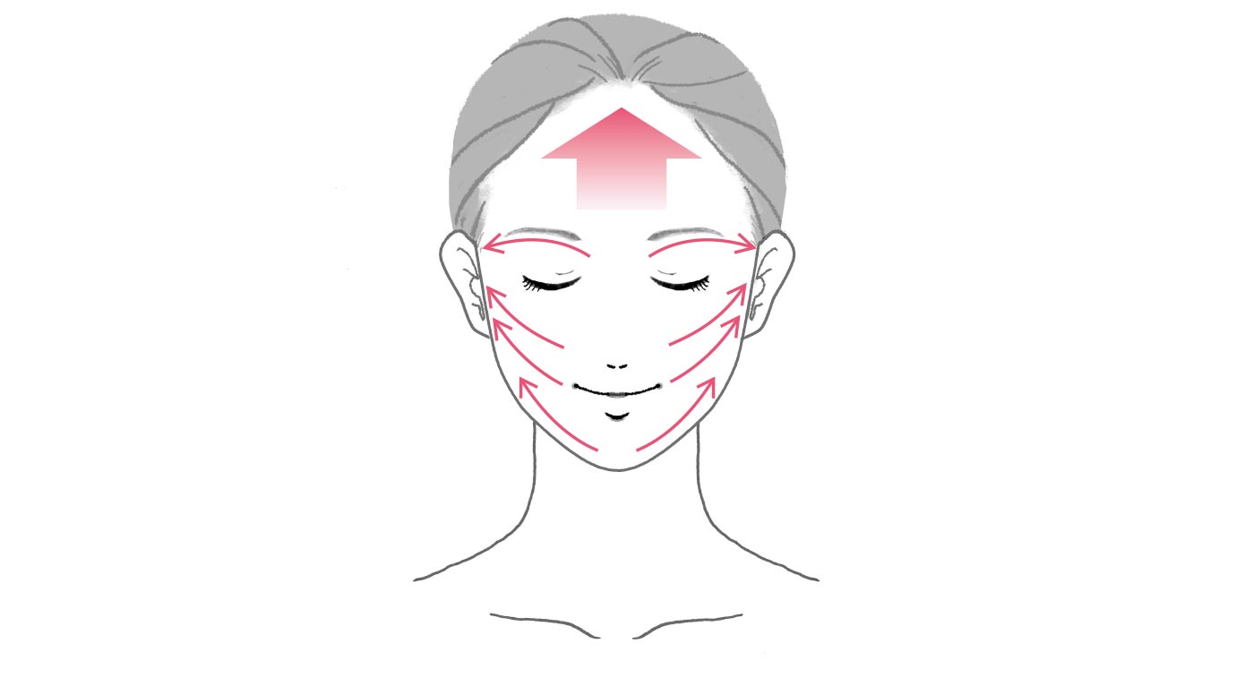 全体にのばし、引き上げるようになじませます。(両頬、額)