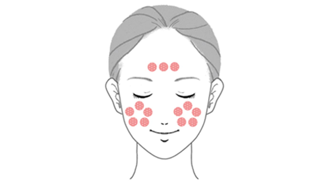パフに適量をとり、両頬と額に広げながらおきます。ぽんぽんと軽くたたきこむように顔全体につけ、カバーしたい部分には、さらに重ねづけします。
