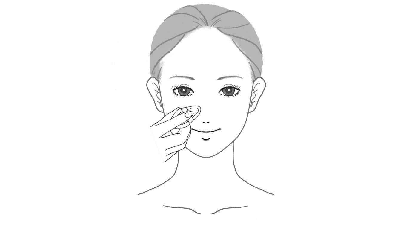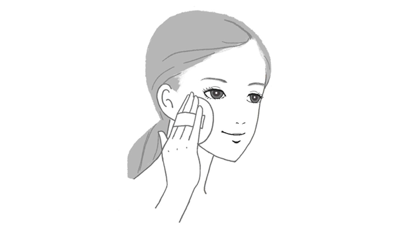 広い部分は、パフ全体を使って肌表面をすべらせるようにやさしくらせんを描きながら顔の中心から外側に向かってのばします。