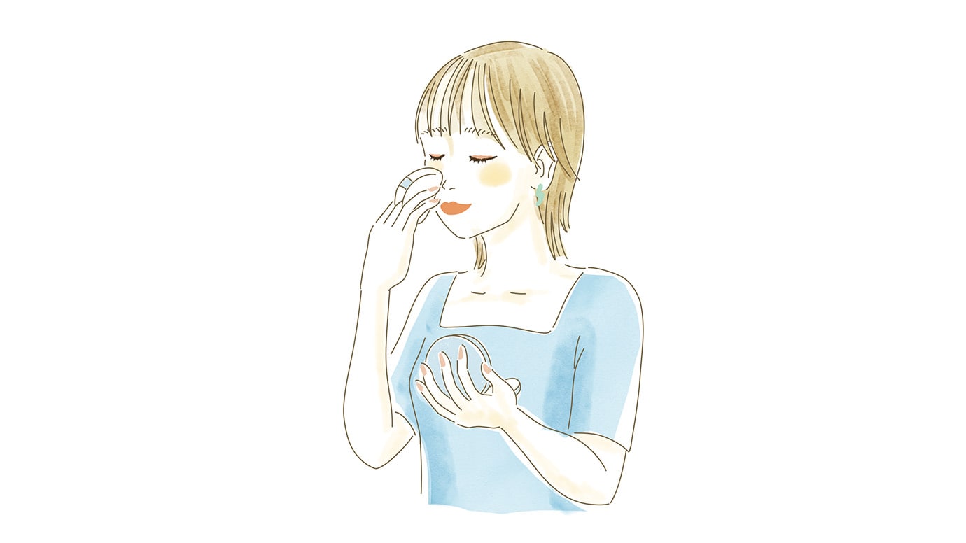 肌を軽くすべらせるように。小鼻など細かいところはパフを折り曲げて塗布します。